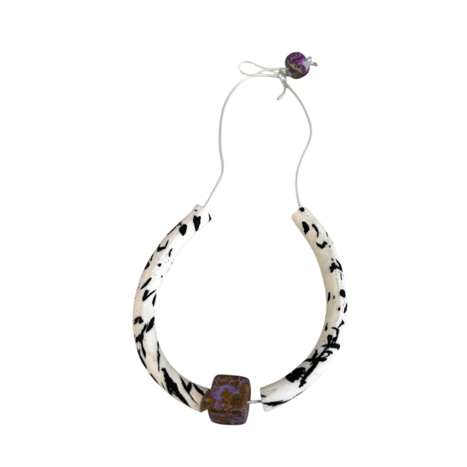 Handcrafted polymer clay necklace with a bold U-shaped design in white and black marbling.