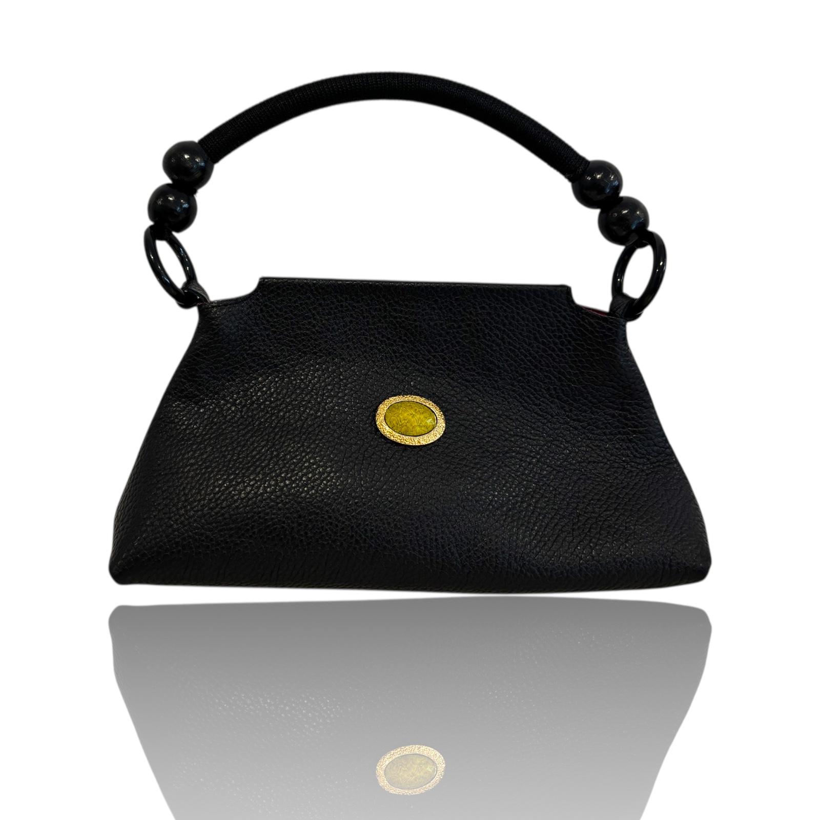 Small tote bag crafted from premium full-grain calf leather with a soft suede back. Features a distinctive resin top handle and elegant gold-tone U-shaped detail. Comes with a protective dust bag.