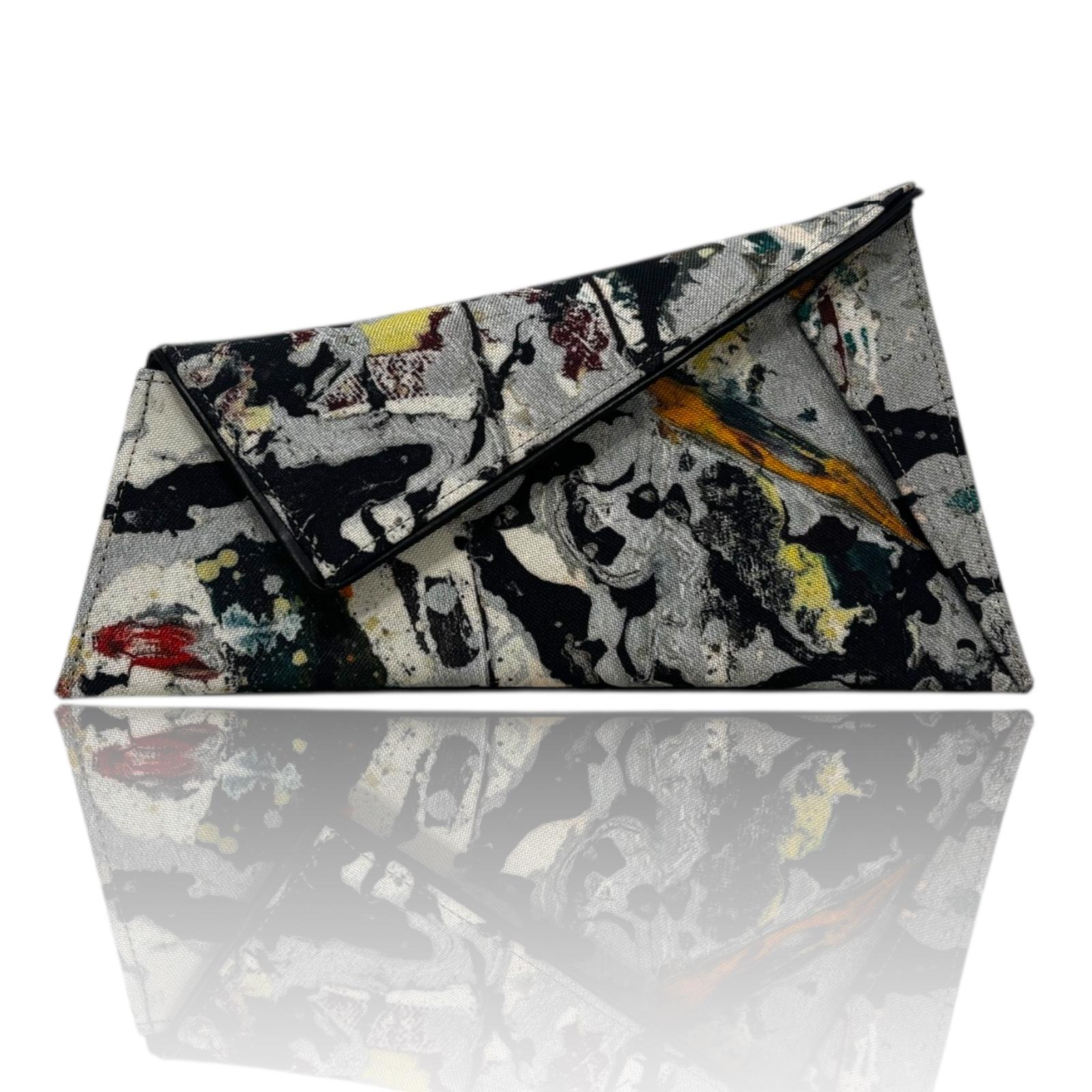 Small asymmetric clutch made of canvas with detachable strap.