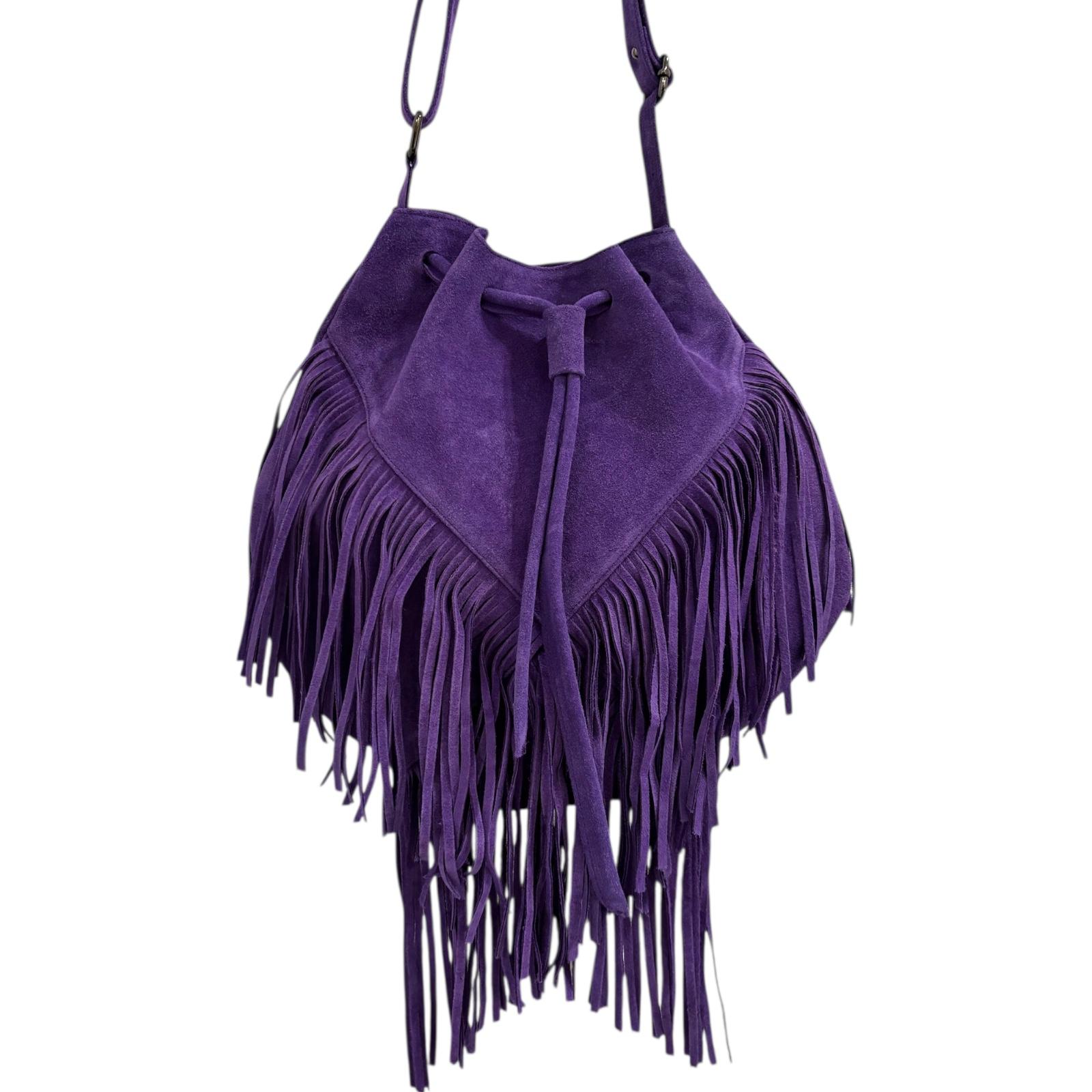 Medium cross- body bag made of suede leather with leather fringe details with adjustable strap.