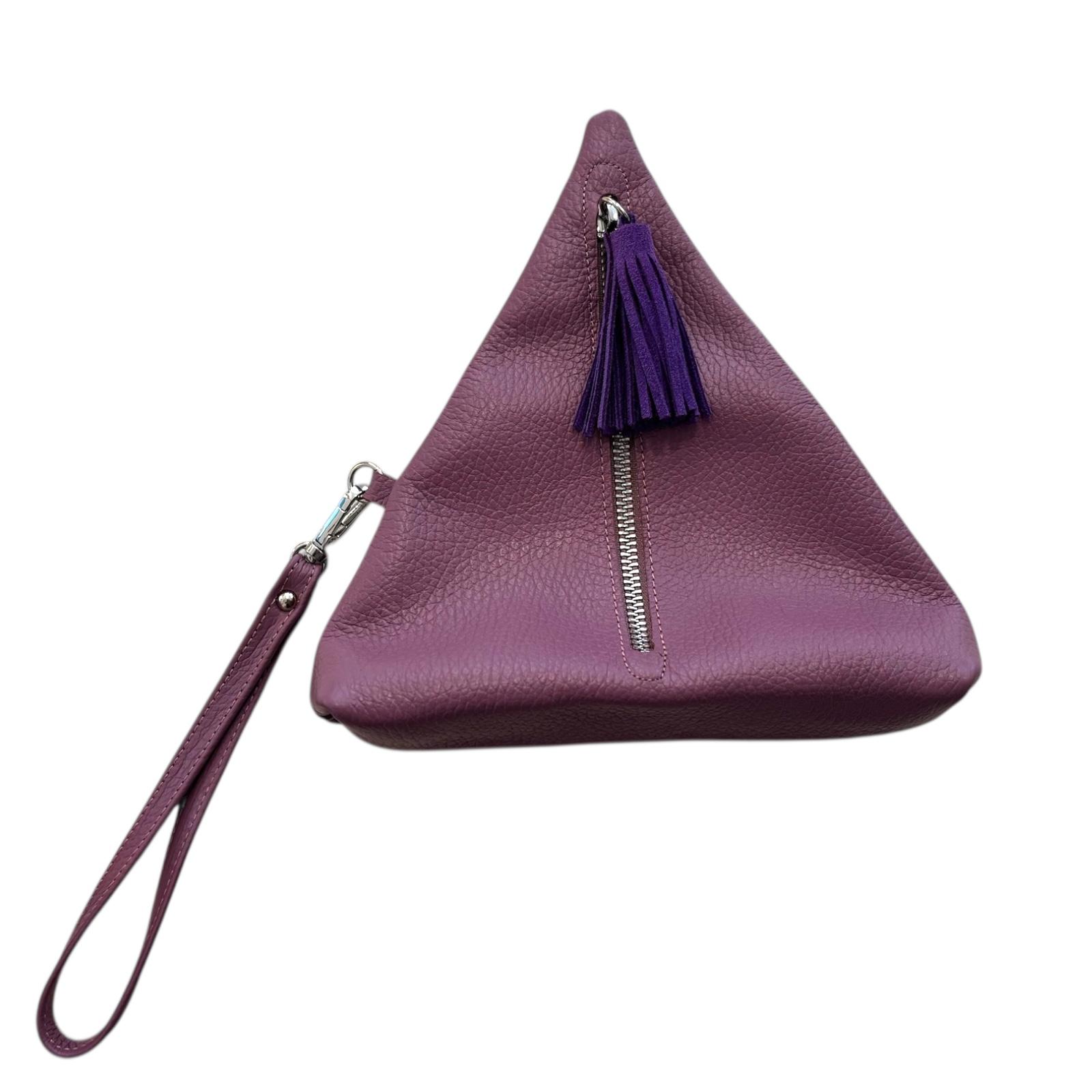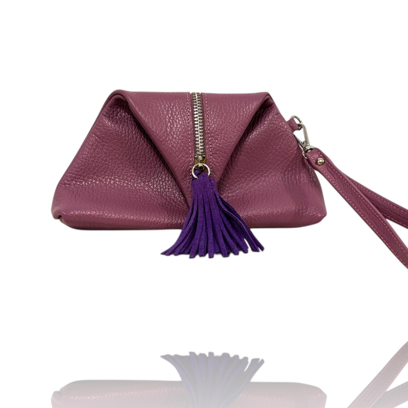 A compact, beautifully structured wristlet crafted from soft, textured leather. Designed with a clever folded silhouette, it features a smooth top zipper and a playful matching tassel. The detachable wrist strap makes it easy to carry on its own or slip inside a larger bag. Perfect for your essentials—keys, cards, lipstick—stylish and practical for day or night