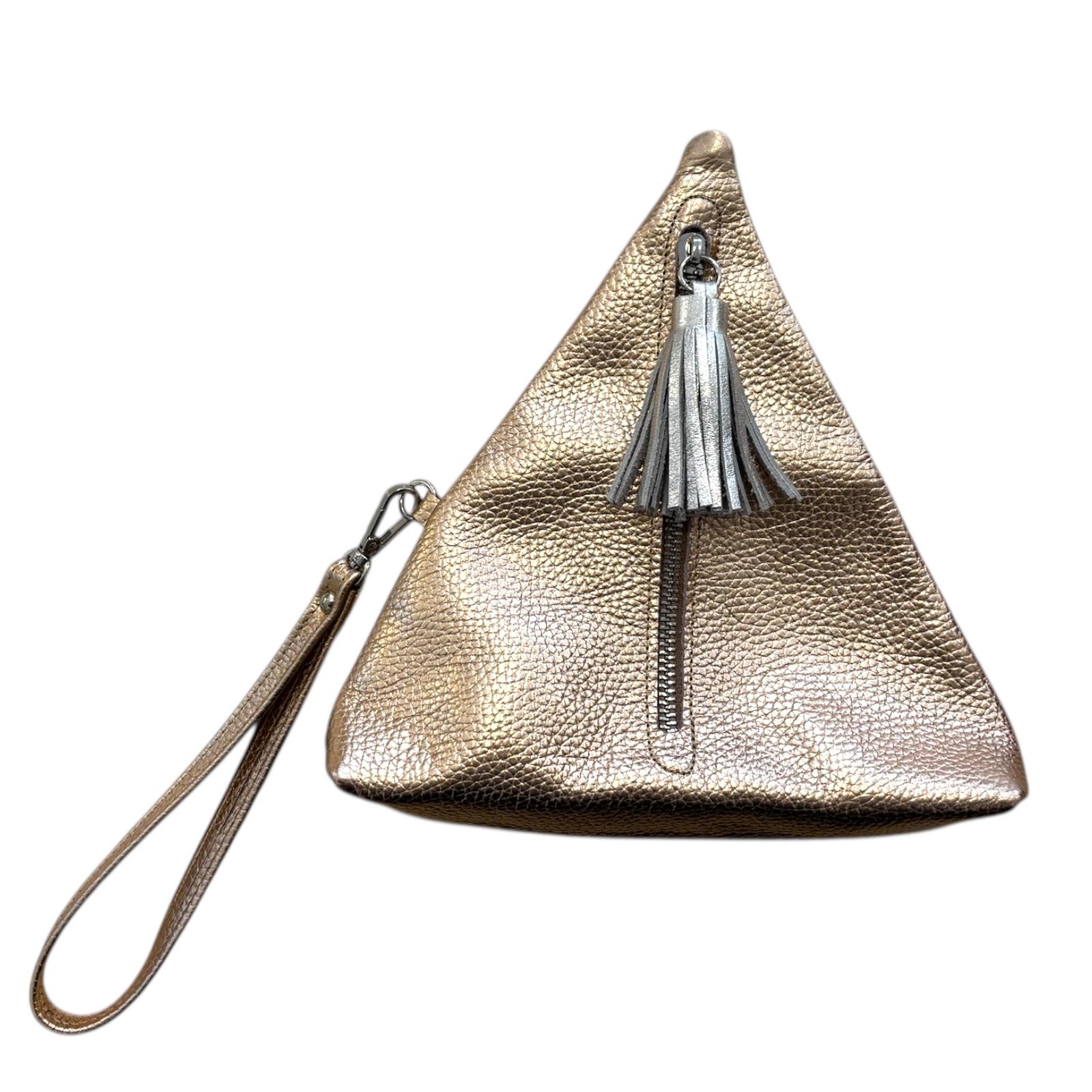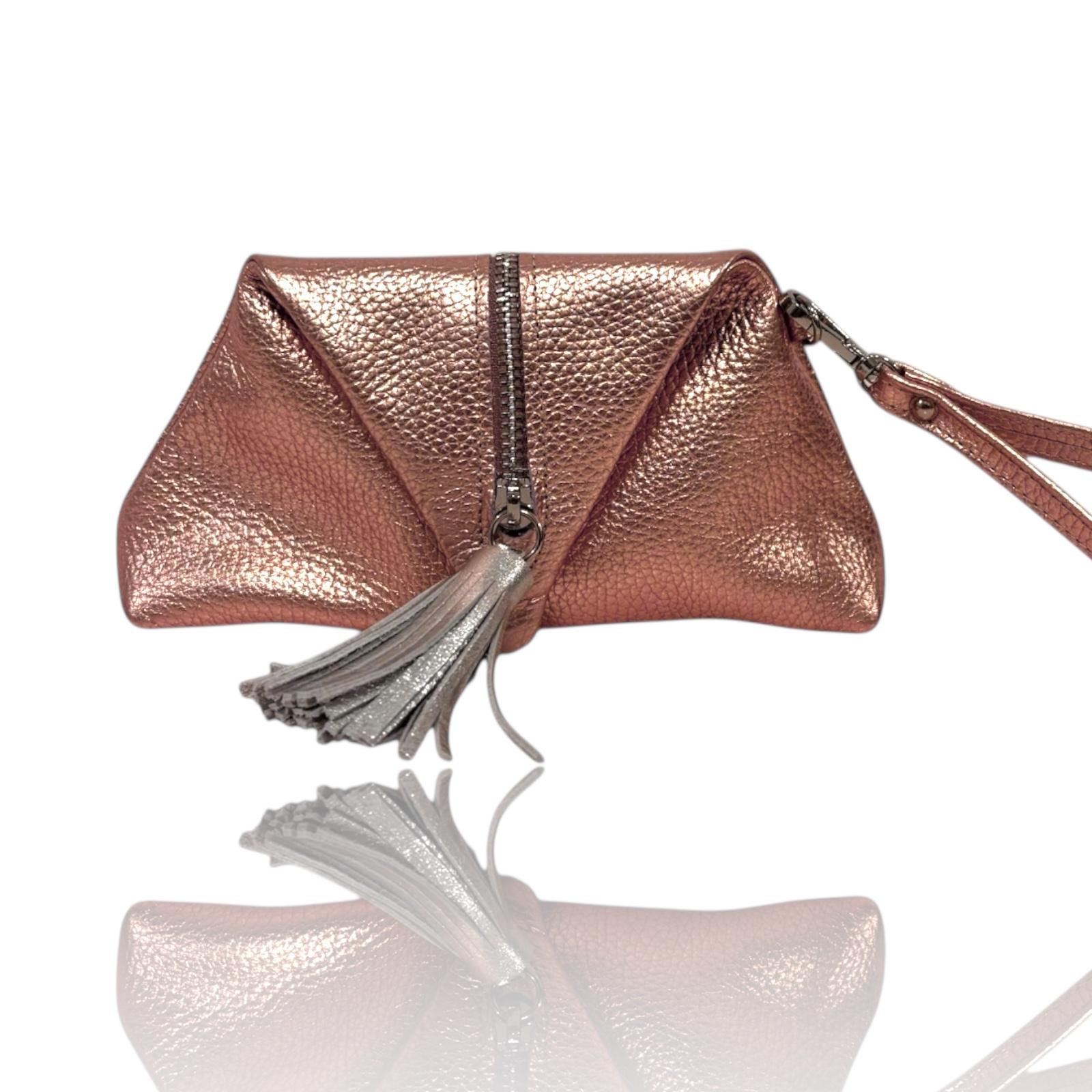 A compact, beautifully structured wristlet crafted from soft, textured leather. Designed with a clever folded silhouette, it features a smooth top zipper and a playful matching tassel. The detachable wrist strap makes it easy to carry on its own or slip inside a larger bag. Perfect for your essentials—keys, cards, lipstick—stylish and practical for day or night